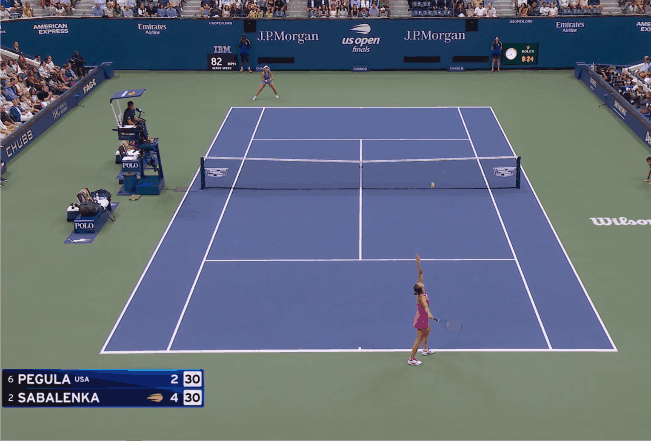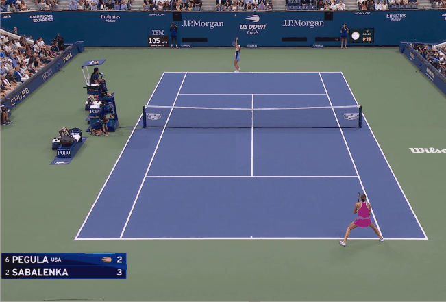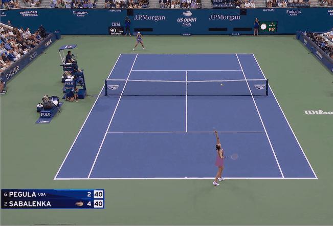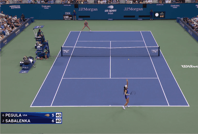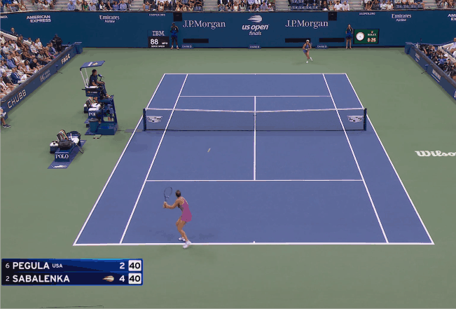 Here’s an early example from the first set – despite a strong Pegula return, Sabalenka is able to push Pegula from side-to-side behind the baseline with two strong backhands, before coming forward to finish the point: