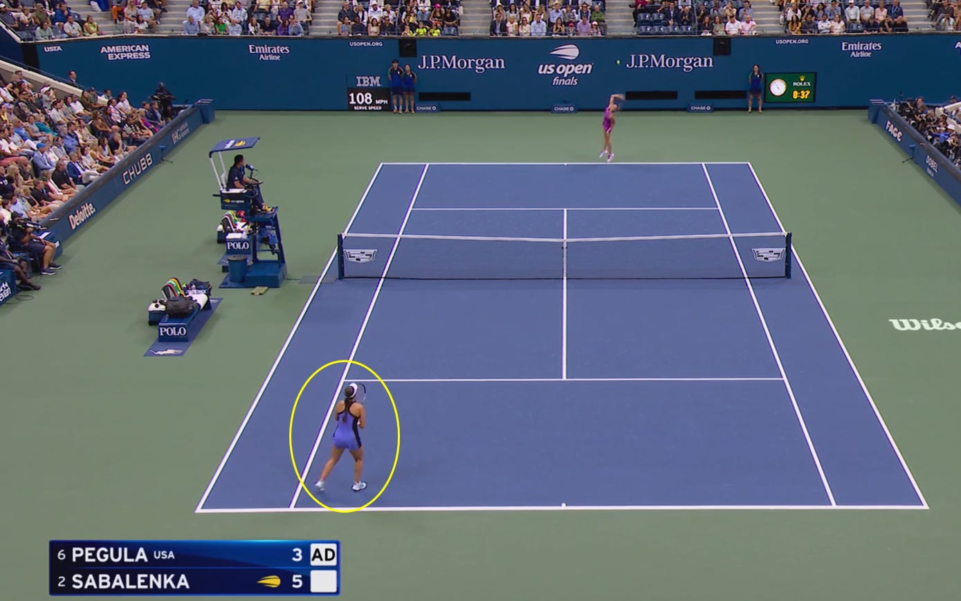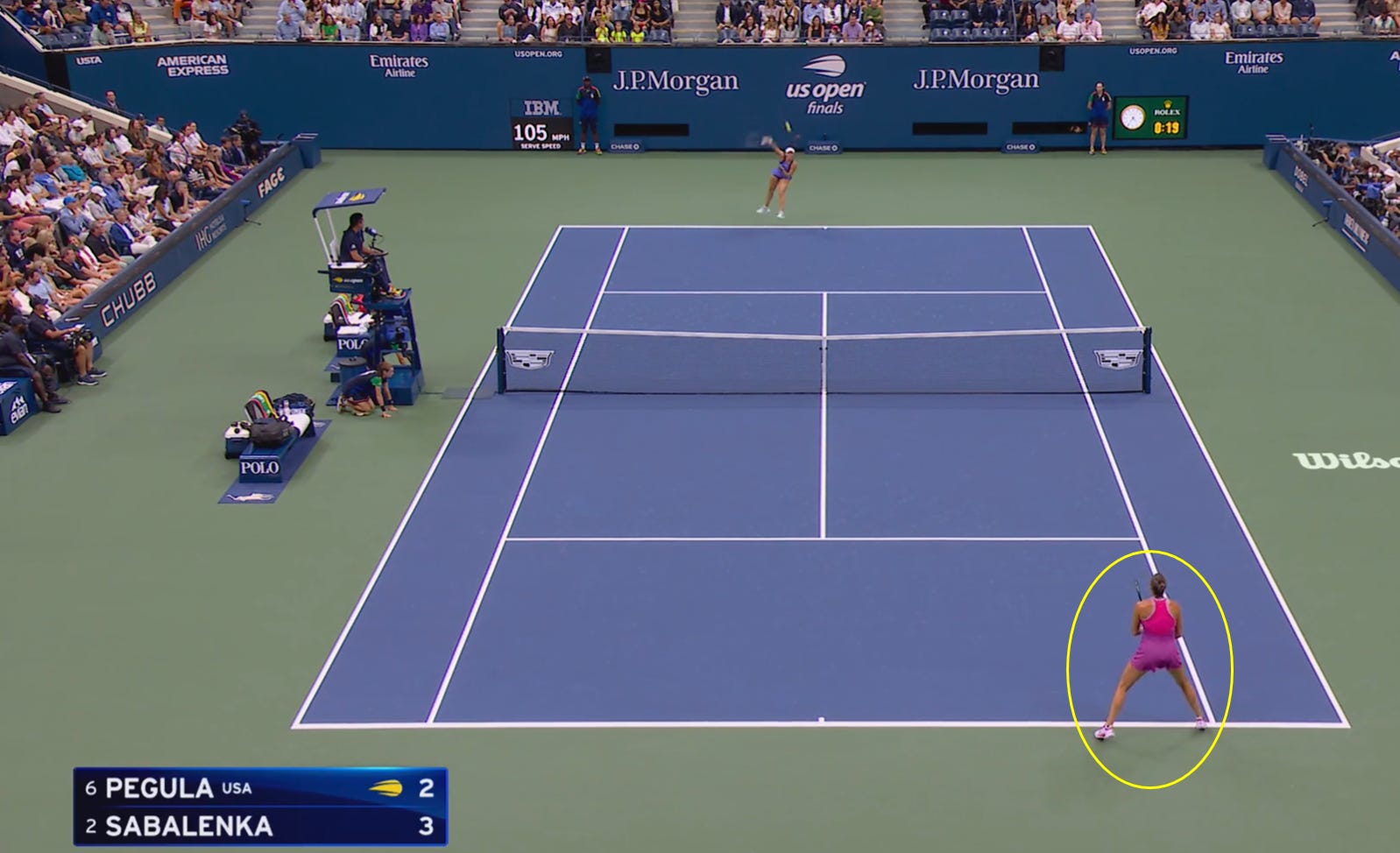 Sabalenka wasn’t quite as aggressive with her return positioning as Pegula, but she was still easily able to hit through the ball when returning: