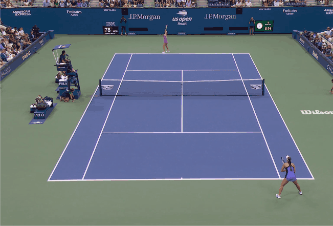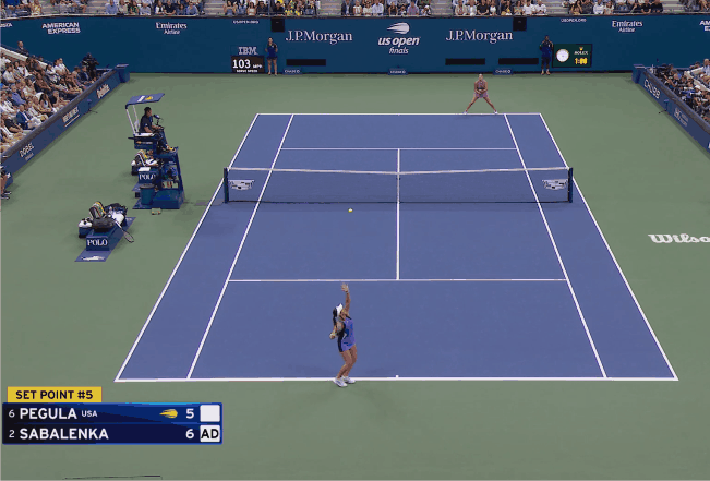 An example of Sabalenka’s continued variety on big points comes at set point #5 in the first set. Pegula is once again behind the baseline, trying to get back into a central position, anticipating another big strike from Sabalenka. Sabalenka hits a nicely disguised drop shot cross-court. Pegula can’t get to the ball with enough time to spare, and Sabalenka claimed the set: