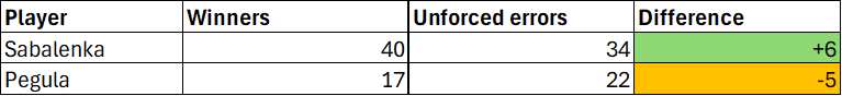 Although Pegula is one of the few who has the defensive skills to absorb some of Sabalenka’s hitting – Sabalenka still managed to blast 40 winners from 88 points won.