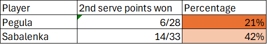 Another point of note in the final was how both Pegula and Sabalenka punished each other’s second serves. Sabalenka ended up with the edge, but still won well under half of her own second serve points: