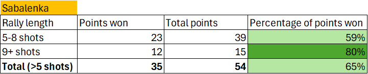Sabalenka won 12/15 (80%) points on rallies that were 9+ shots, which is an impressive feat against Pegula, who is rock-solid at keeping balls in play and has strong defensive skills. Overall, for rallies extending beyond 5 shots, Sabalenka won nearly two-thirds (65%):